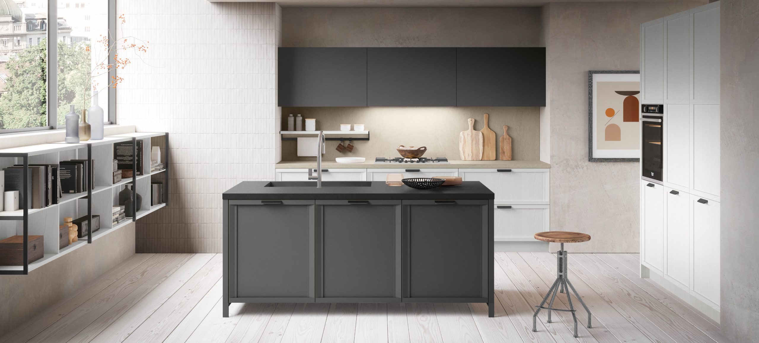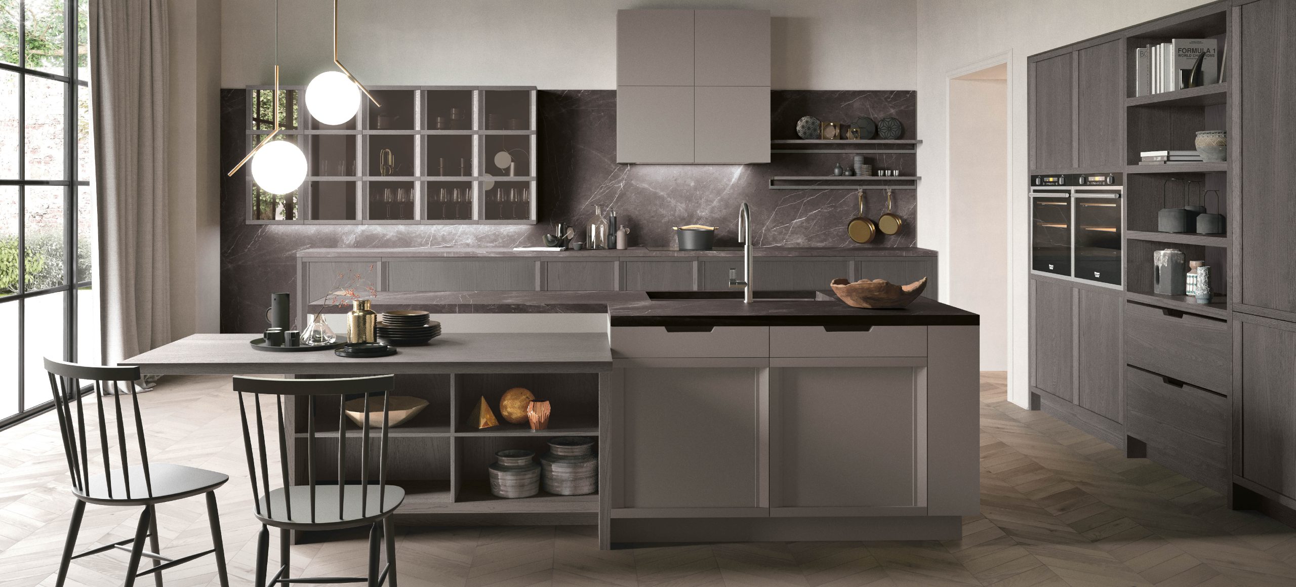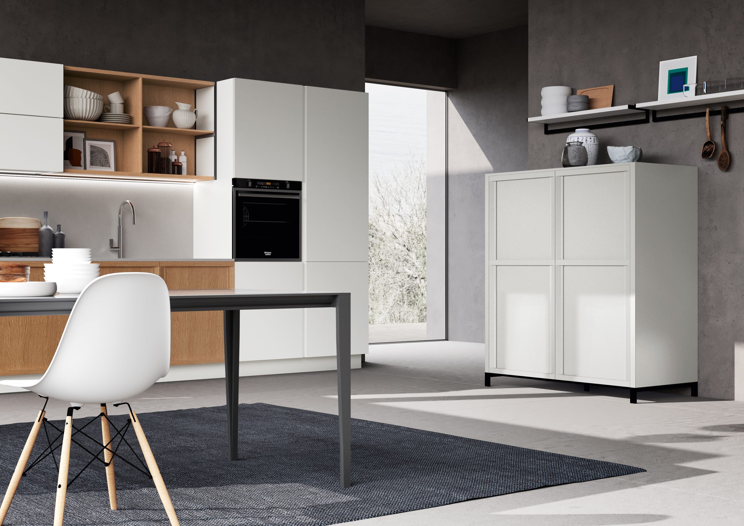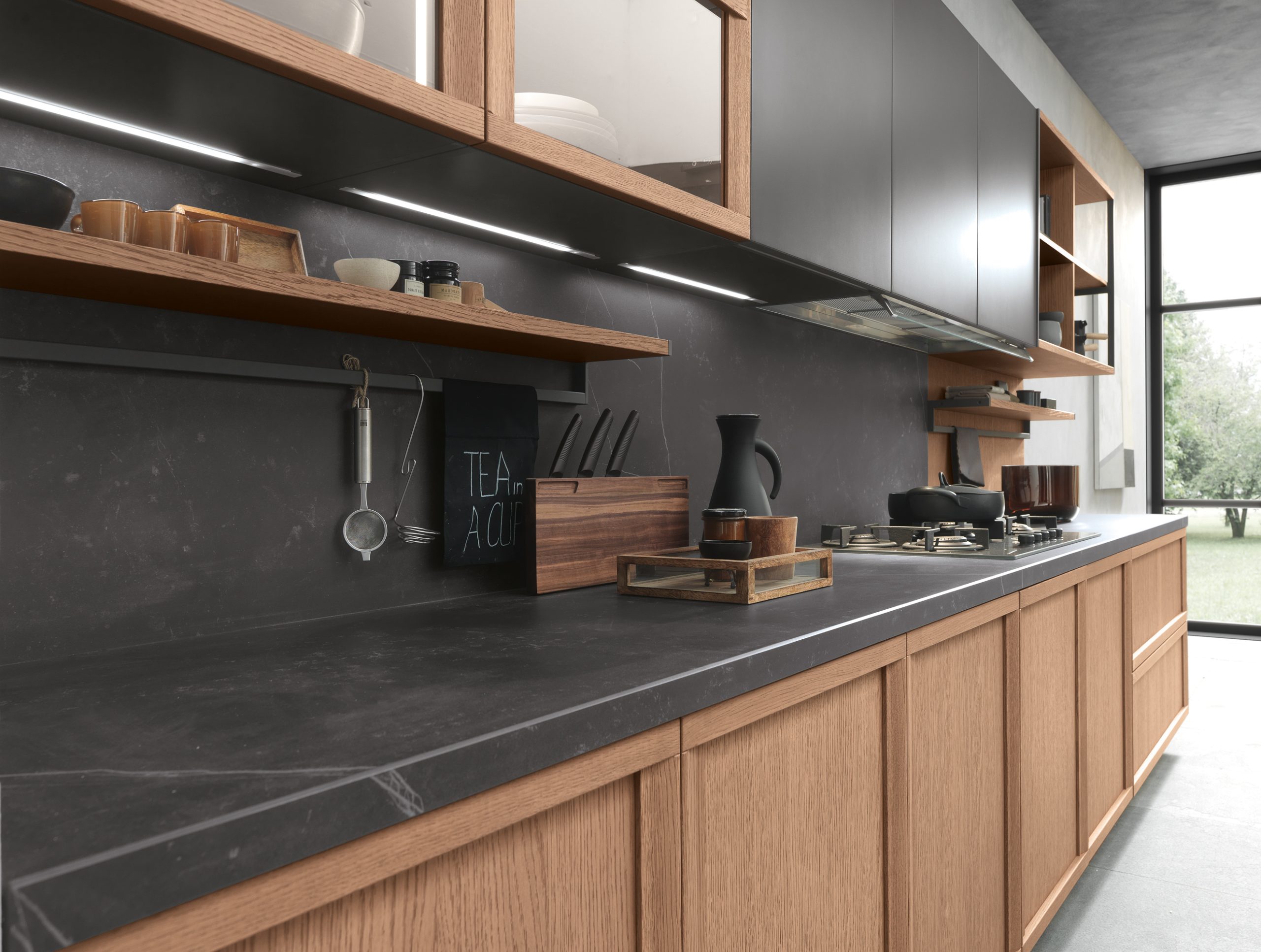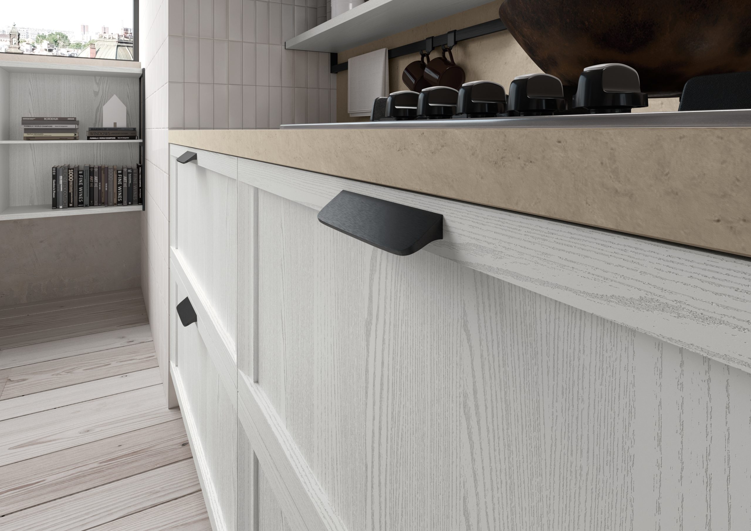 Традиционно классические элементы – рамочные фасады и большие витрины – украшают кухню с линейной конфигурацией, хорошо вписываясь в интерьерный контекст как с урбанистической, так и с традиционной стилистикой. Легкая периметральная рамка фасада со скошенным профилем контрастирует с тонкими горизонтальными поперечинами с удобной ручкой.