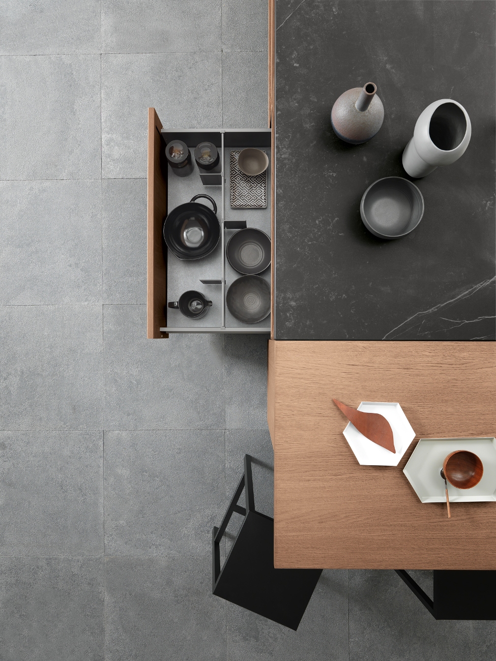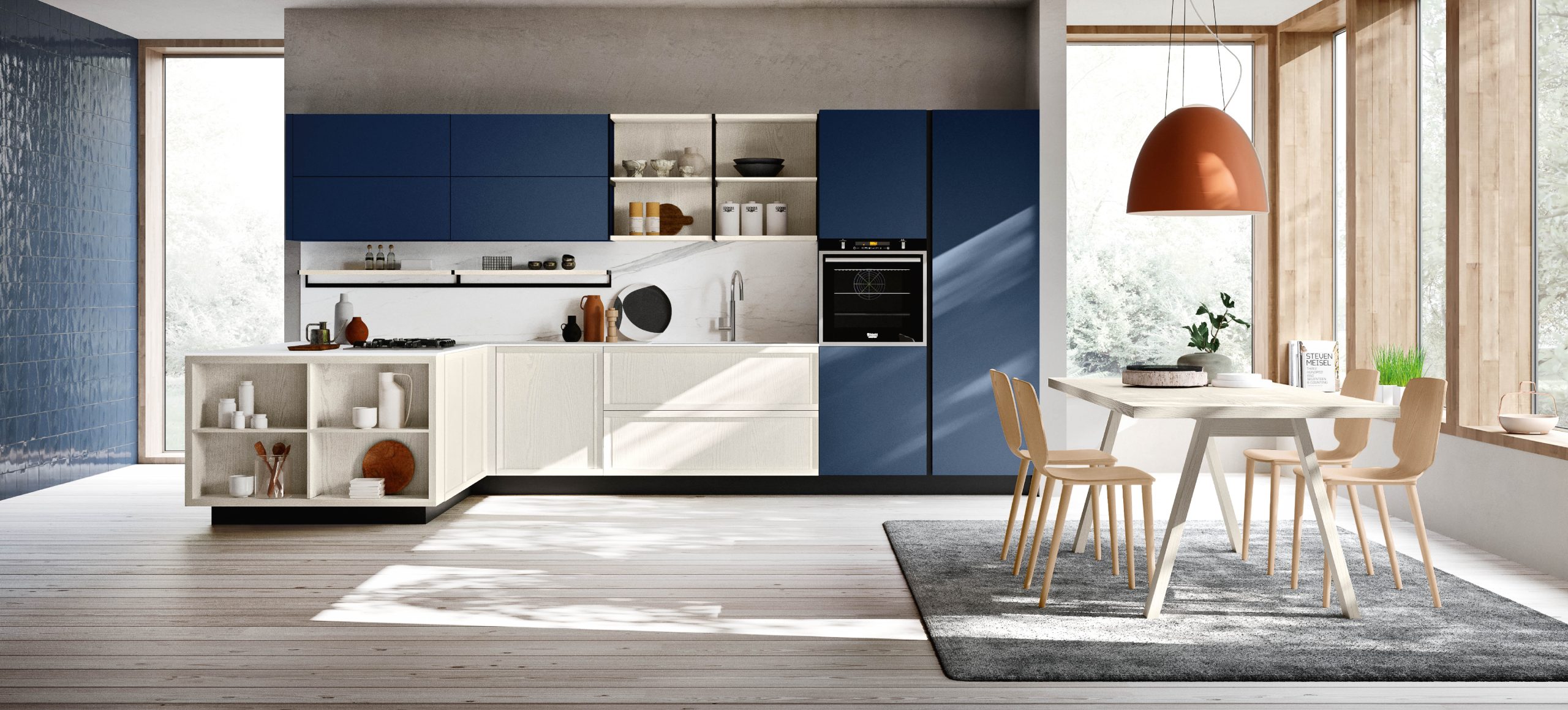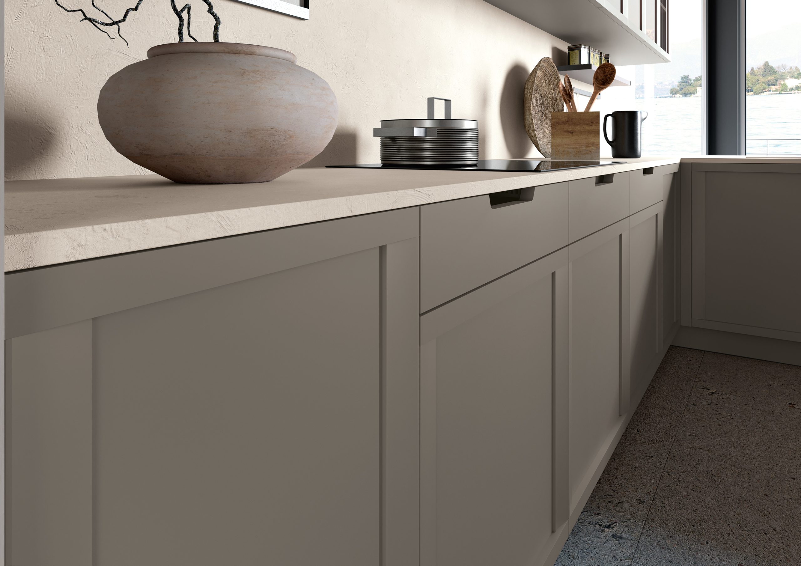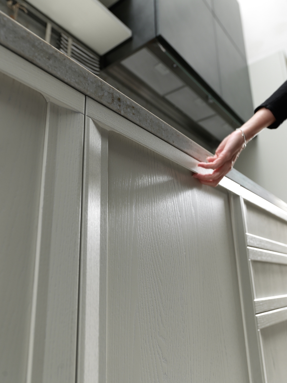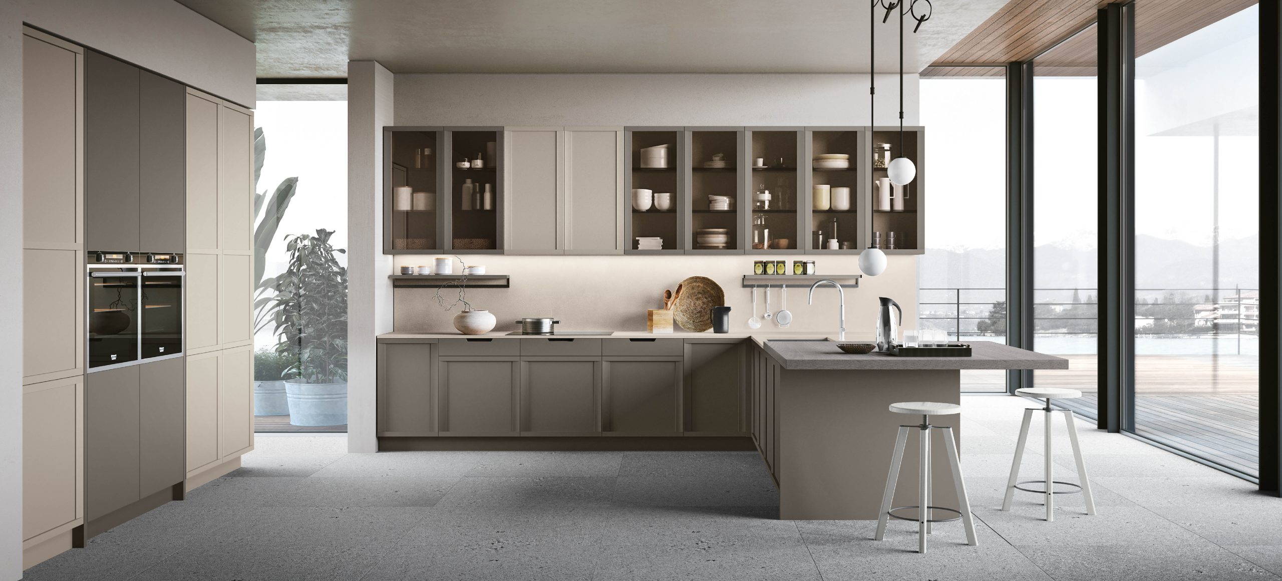 Традиционно классические элементы – рамочные фасады и большие витрины – украшают кухню с линейной конфигурацией, хорошо вписываясь в интерьерный контекст как с урбанистической, так и с традиционной стилистикой. Легкая периметральная рамка фасада со скошенным профилем контрастирует с тонкими горизонтальными поперечинами с удобной ручкой.