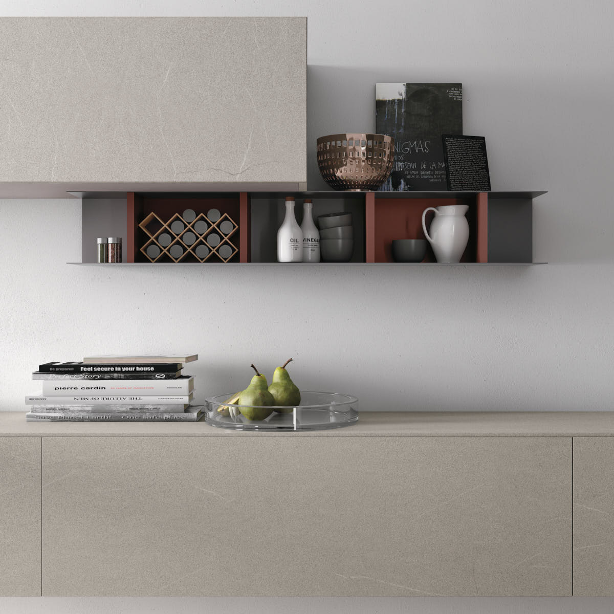 В центре внимания – покрытые Уф-лаком поверхности в глянцевом и матовом исполнении. Четкие геометрические линии композиции подчеркиваются элегантной цветовой палитрой: оттенки серого и зеленого цветов хорошо сочетаются с промежуточными нюансами светлых и темных тонов, а насыщенный красный цвет добавляет колорита лаконичному стилю Alevè.